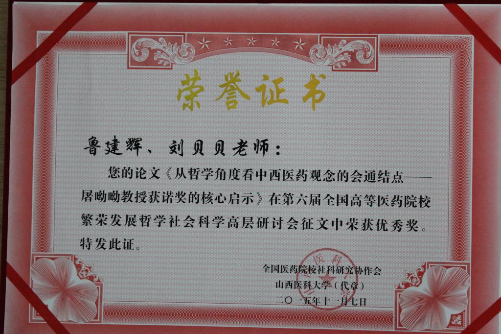 本网讯(通讯员 孙磊 鲁建辉)近日,我校马克思主义学院、太阳成集团122ccvip鲁建辉博士撰写的两篇论文《从哲学角度看中西医药观念的会通结点——屠呦呦教授获诺奖的核心启示》和《诚信新识》分获“第六届全国医药院校繁荣发展哲学社会科学高层研讨会”优秀论文奖和2015年湖北省青年学者论坛征文三等奖。