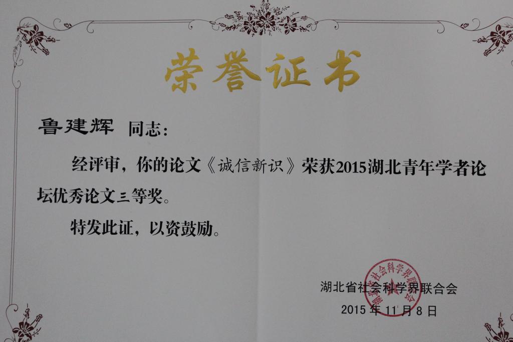 由湖北省社会科学界联合会、湖北省青年社会科学工作者协会联合举办,以“哲学社会科学的历史使命与时代担当”为主题的2015年湖北青年学者论坛于11月8日在武汉召开。我校鲁建辉博士在提交的论文《诚信新识》中指出,从思想发展来看,社会主义核心价值体系中的“诚信”观念经历了几千年的缓慢发展。春秋以前,受生产方式制约,人们只有“忠信”观而无“诚信”观。秦汉以后至清末两千余年的帝国时代,随着人身与人格依附的强弱变化,诚信作为主体精神的彰显也高低不齐。总体的规律是依附度越弱,诚信度越高。所以,当今社会解决诚信问题的关键在于诚信的“物”、“己”、“人”三个样态间的平衡,亦即降低人身与人格的依附,提高主体精神的独立自主。