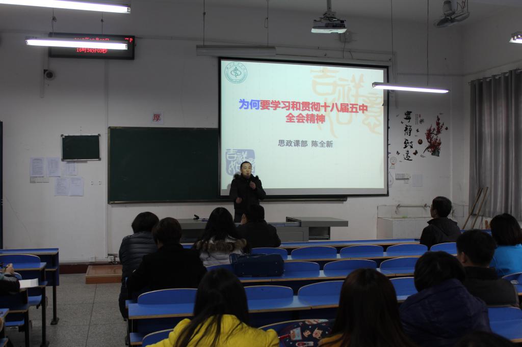 本次学习由思政课部陈全新博士主讲,陈博士从“一项政治任务、思想跟上形势、获得教育和启发、发现研究课题、成果转化与能力提升”五个方面做了学习辅导报告,并与老师们分享了自己关于五中全会精神的学习体会。