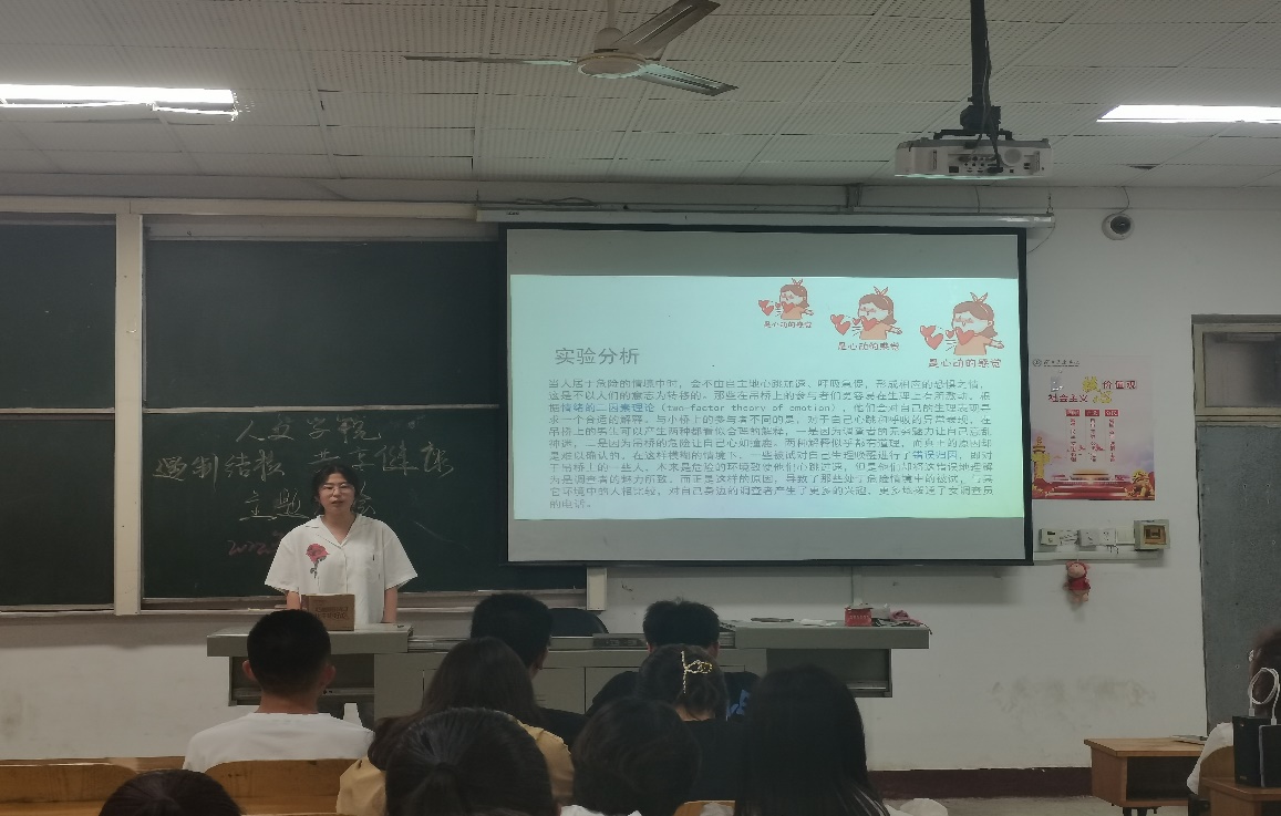 参赛选手潘丹青通过卡皮诺拉吊桥实验及相关影视作品给同学们解释了什么是吊桥效应,同时也联系了生活中的实例,让同学们更深刻地懂得了在生活中该如何运用吊桥效应。