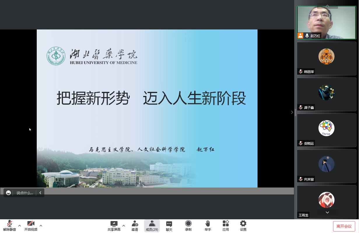 辅导员韩丽萍跟同学们通报了毕业生目前的就业进展情况,再次强调了今年严峻的就业形势,除了超千万毕业生外,还有因疫情、政策等原因需要再就业人群的竞争,她希望同学们能抓住6、7月的就业黄金期,先就业再择业。