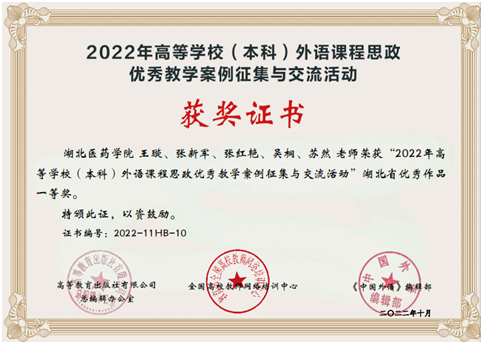 本届大赛于2022年4月启动,历时半年,湖北省共20余所本科院校参加此次比赛。 自该赛启动以来,学校、学院高度重视,外语课部组建以张新军教授为指导,王璇老师为项目负责人,张红艳老师,吴桐老师和苏然老师为组员的课程团队。课程团队根据大赛要求精心设计教学流程,撰写教学方案,录制课程讲解视频,最终历经初赛,复赛喜获湖北省一等奖。