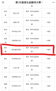 本网讯(通讯员 薛军锋)近日,第二十九届湖北省翻译大赛决赛成绩揭晓,我校第一临床学院2021级的胡万鑫同学喜获非专业英语A组笔译组一等奖。 作为湖北省专业、权威、极具品牌价值的年度翻译赛事,湖北省翻译大赛在全国翻译界享有盛誉,已连续成功举办28届,累计参赛逾45万人次。