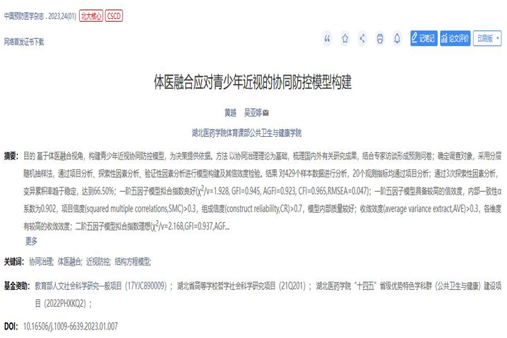 本网讯(通讯员 黄越)太阳成集团122ccvip体育课部一直关注“体医融合”对不同人群的健康促进研究。近日,黄越团队最新研究成果“体医融合应对青少年近视的协同防控模型构建Construction of integrated physical and medicalcare model forthe prevention and control of adolescent myopia”解析了“体医融合”应对青少年近视的多维影响因素及协同作用。发表在《中国预防医学杂志》(中国高质量科技期刊T3类),体育课部吴亚婷老师为通讯作者。