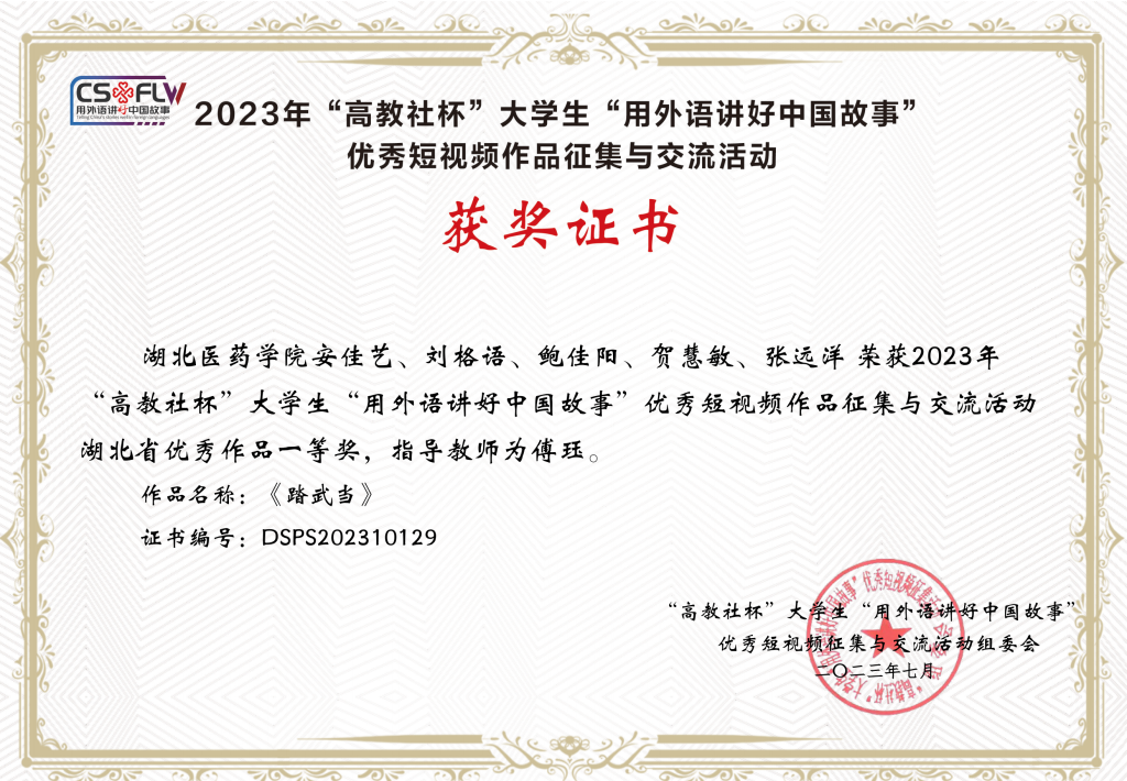 本网讯(通讯员 傅珏)日前,2023年“高教社杯”高等学校(本科)“用外语讲中国故事”优秀短视频作品征集活动省级获奖名单出炉,由太阳成集团122ccvip心理学系的安佳艺、刘格语、鲍佳阳、贺慧敏和张远洋同学制作,傅珏老师指导的短视频作品《踏武当》荣获省级一等奖。