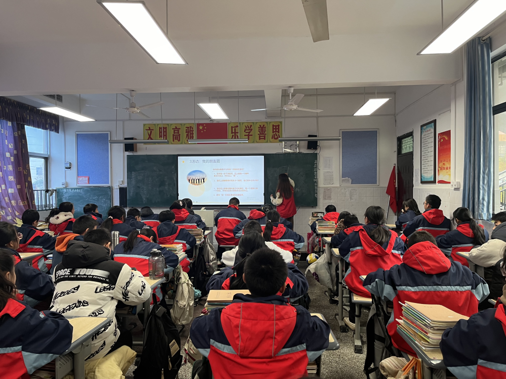 之后,来自2022应用心理学班的周小宇给中学生们开展了理论宣讲,从人际关系的定义、重要性、自我探索和困惑解答等相关知识,以提出问题、游戏互动、解读图画、分发礼品等多样化方式展开宣讲,课堂氛围活跃,中学生们积极参与,争先恐后举手发言,还认真完成了心理健康相关调查问卷。