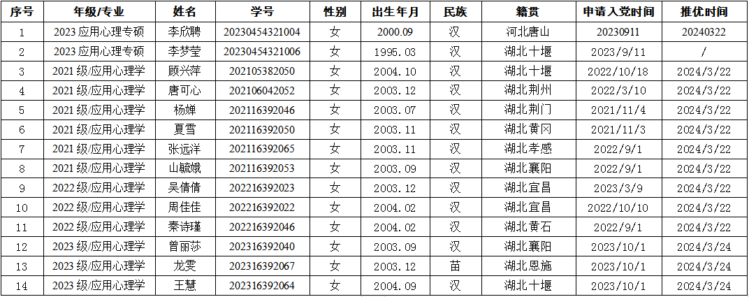 根据个人现实表现和党支部培养教育考察情况,经支委会研究,拟确定李欣聘等14名同志为入党积极分子。按照发展党员工作有关要求,现对入党积极分子的基本情况予以公示,公示期7天,自2024年5月11日—5月17日。公示期间,党员和群众可来电、来信、来访向党支部反映其在理想信念、廉洁自律等方面的情况和问题。也可直接向分党委反映问题。联系电话:07198891153。拟确定入党积极分子基本情况一览表: