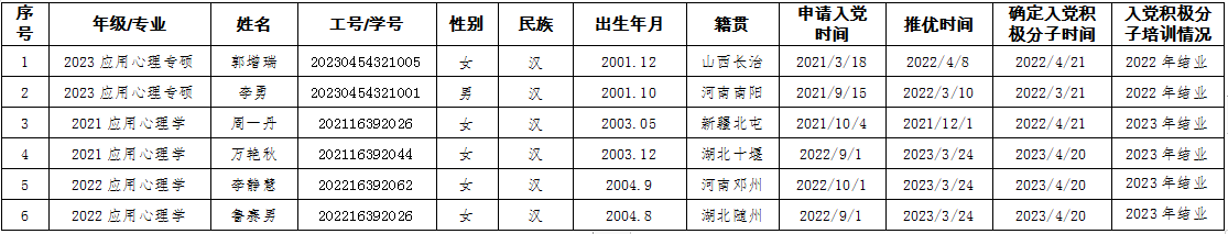 经党支部培养教育和考察,在听取培养联系人、党员和群众意见的基础上,经支委会2024年5月11日讨论,拟确定郭增瑞等6名同志为发展对象。根据发展党员工作有关要求,现将名单公示如下: