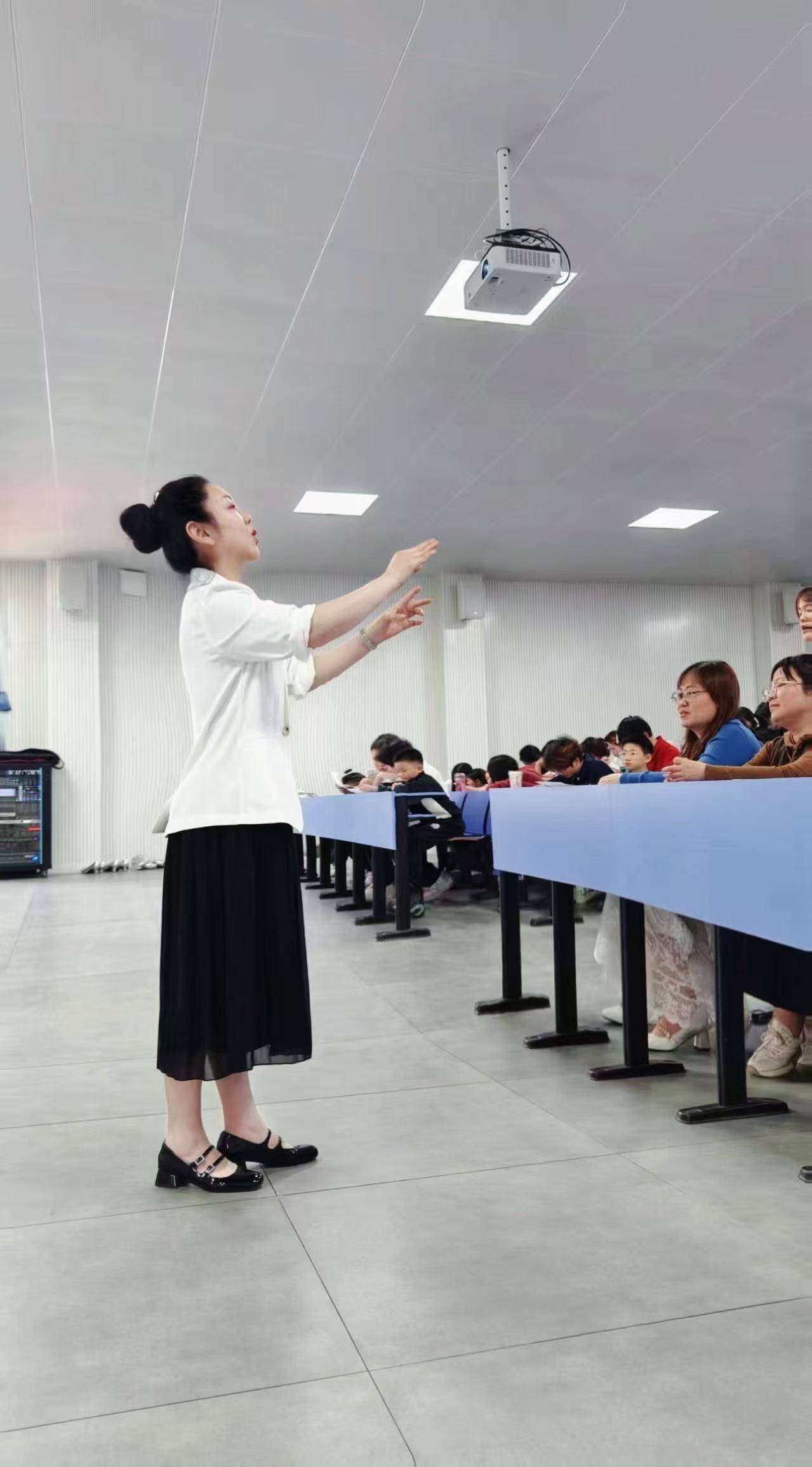 李霖教授在承担每周24节繁重教学任务的同时,仍以一腔热忱投身于合唱团排练。历时一个月,她牺牲全部周日休息时间,带领学生从零起步打磨作品。面对《理想照耀中国》中高音演唱的技术难题,她创新采用"分层突破法":将合唱团拆解为小组进行针对性发声训练,逐一声部攻克音准与情感表达,最终将领唱、重唱、合唱交织成立体和声。在排练耳熟能详的《没有共产党就没有新中国》时,李教授另辟蹊径,聚焦"用专业重塑经典"。她以声乐教学中的咬字吐字为切入点,指导学生通过气息控制、元音归韵等技巧,让每个字句如金石掷地,既保有原曲的精神内核,又赋予其学院派合唱的艺术质感。当学生们以清澈透亮的音色唱响"他指给了人民解放的道路"时,熟悉的旋律焕发出令人耳目一新的生命力。
